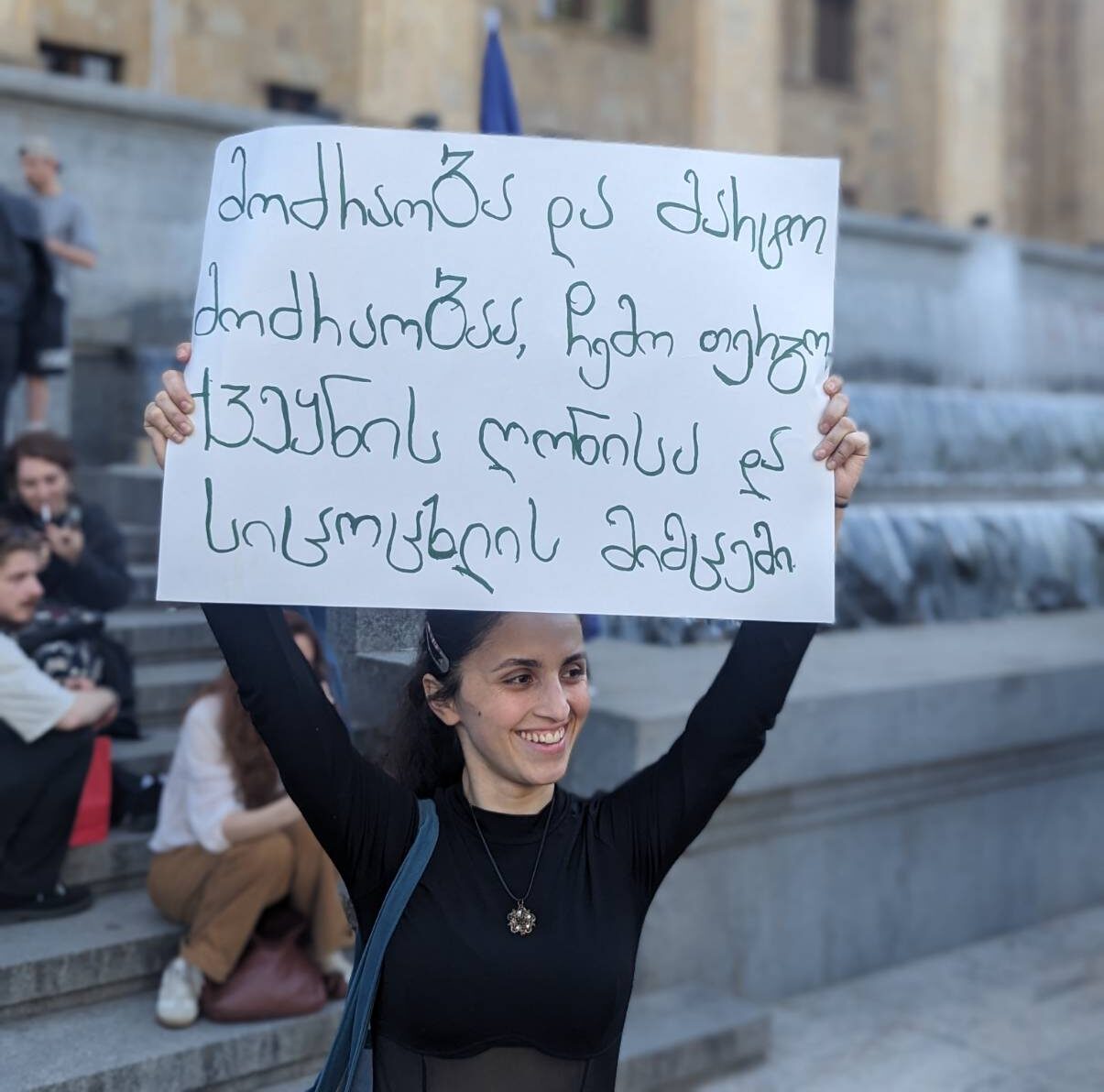 Megi Diasamidze’s lawyer, Shota Tutberidze, described the circumstances of her detention as a “very funny, primitive special operation.” He said his client was detained in Lanchkhuti, western Georgia, while traveling to her village by bus. Her phone was seized, she was denied access to legal counsel for nine hours, and her hands were tied behind her back during the hours-long transfer to Tbilisi. He added that she was not told why she was detained.