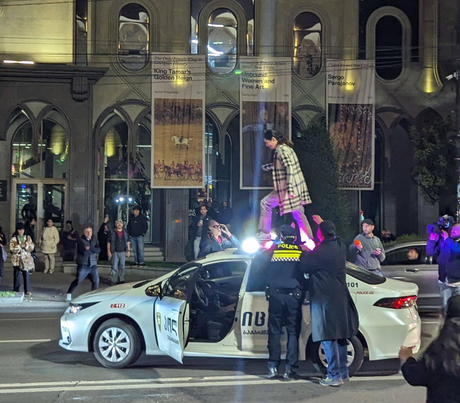 Tbilisi City Court sent Tamar Lortkipanidze, a protester who climbed onto the roof of a police car during the October 22 rally on Rustaveli Avenue, to pre-trial detention, as she faces four to seven years in jail after prosecutors alleged that she damaged the car and punched a taxi driver.